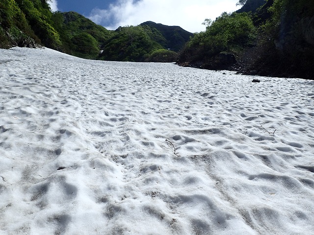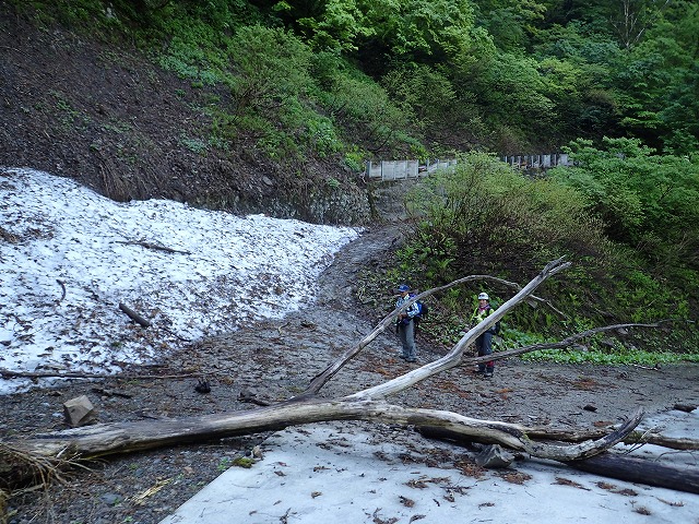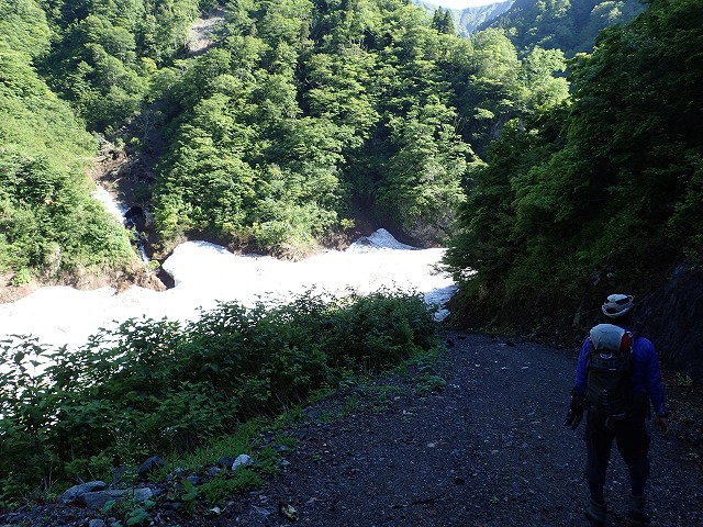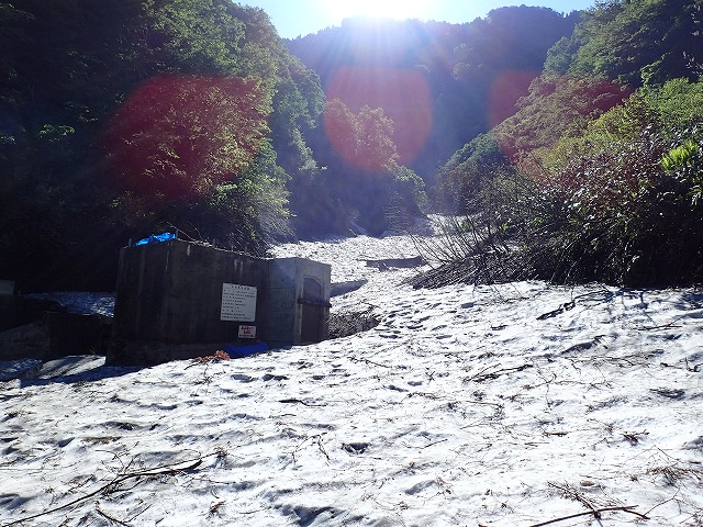 林道を進むと、笠谷の取水口が見えてきました。ここからは、雪渓を進むことになります。