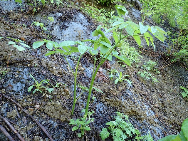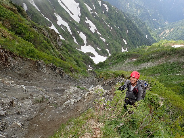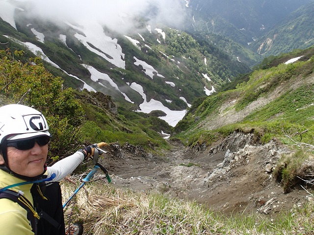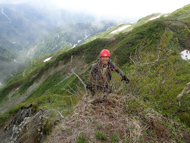 最後の5mは、あまりの急斜面に這い上がることを断念し、横の草付き斜面(細い尾根状)に逃げ、樹につかまってよじ登りました