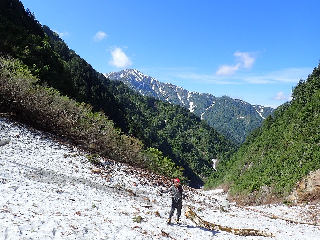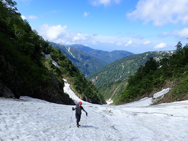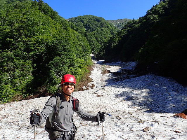 下に見える雪渓が今日ハイクしてきた笠谷。きれいな雪渓です。5月の連休あたりにスキーで来たいところです