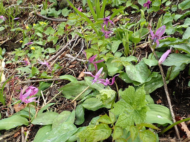 雪渓の横にお花畑を発見 カタクリが咲き誇っています。シラネアオイを筆頭に美味しそうなウドまで