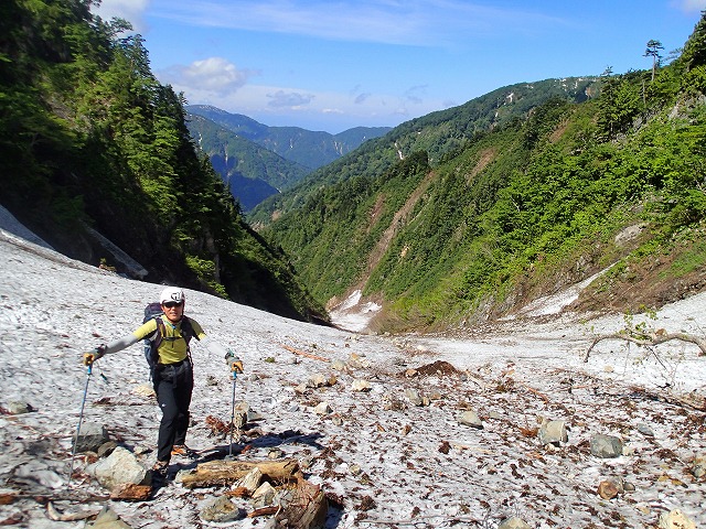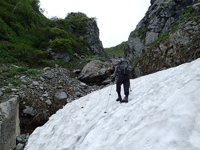 8:11 取水口でアイゼンを装着し出発です。傾斜の緩い雪渓を快調にハイクすることができました。スキーで来ても相当面白いようです。来年の予定コースに入れることに。