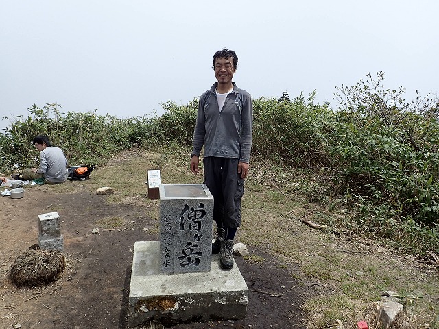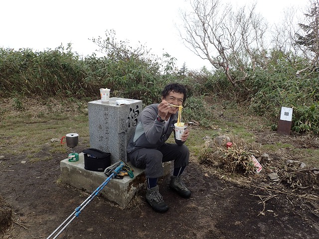 12:18 約1時間で僧ヶ岳に到着。雪渓の雪を溶かし、お湯を沸かしてカップヌードルとおにぎりでエネルギーを補給します。その後コーヒーを飲みながら、「クスミン 今頃ジンギスカンやってるんだろうな。」なんて会話をし、マッタリした時間を過ごしました。