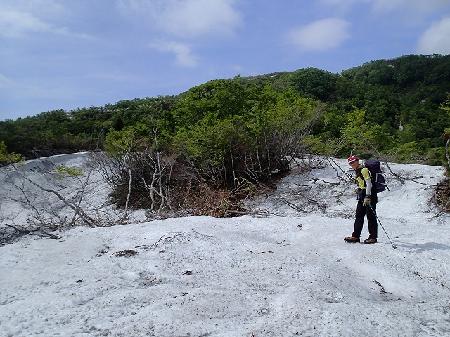 快調に雪渓をつめていくことができましたが、最終の稜線への登り口をどこにするかに悩みました。山スキーのルート図では、駒ヶ岳のすぐ横に出る谷なのですが、雪のない状態では、藪漕ぎが半端ではありません。