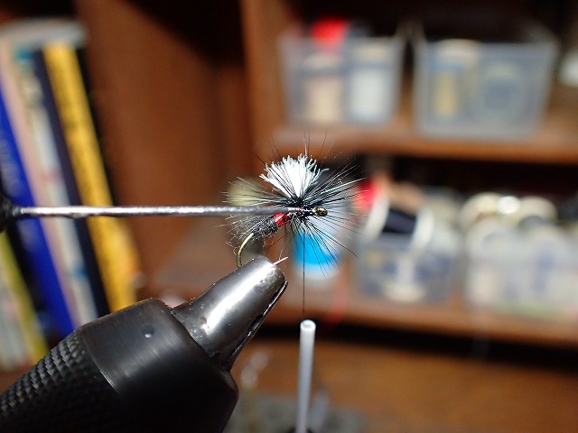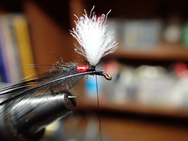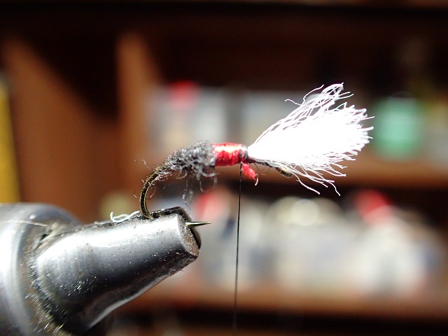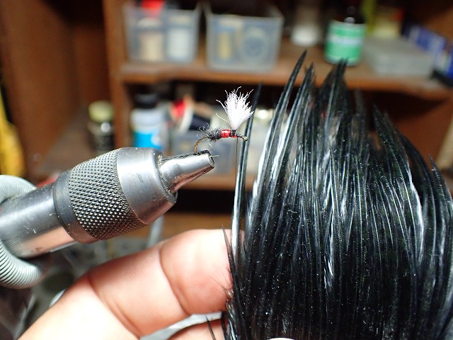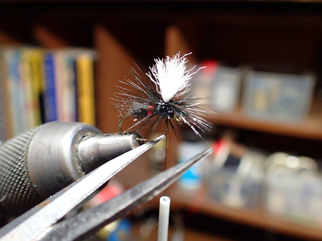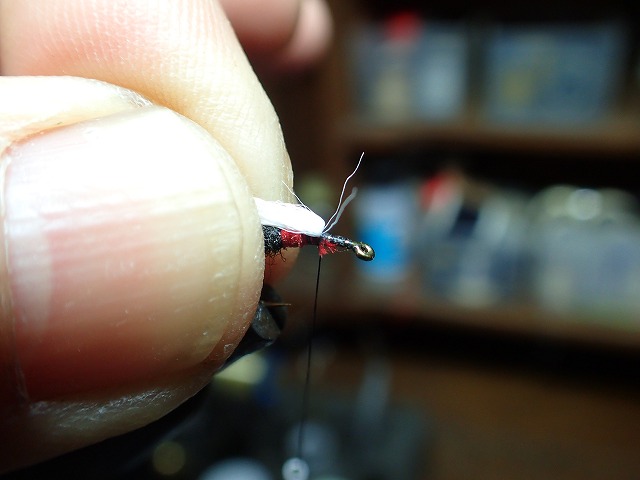 この時カットして残っている毛がスレッドと絡んでハックルの固定がしっかりしたものになります。(ハックルが抜けてこないことが重要なので、ここがミソ)