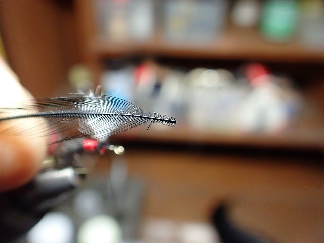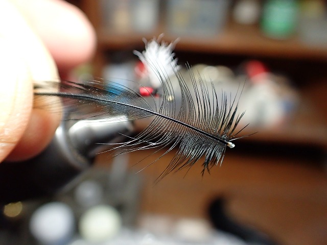 黒のハックルの毛の長さを針の大きさに合わせ、手ごろなものを1枚ぬきます。