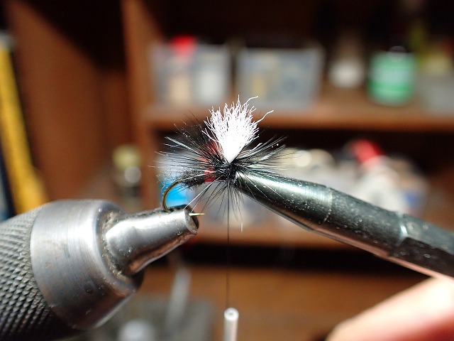 ハックルをスレッドで挟んでとめ、ウイングに巻かれたハックルの上をスレッドで巻いてほどけてこないように補強します。