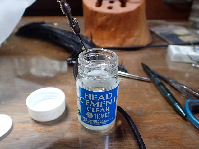 ヘッドからウイングの根元にかけ、2~3滴ヘッドセメントを垂らしてスレッドを固めます。