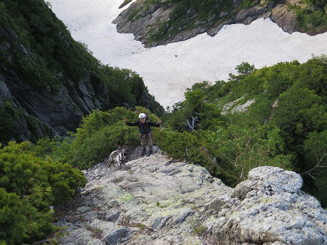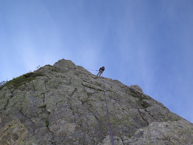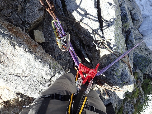 背中にリュックがあるせいか、後ろに引かれる感じが今まで以上にありますが、バックアップのロープを右手で下ろしながらゆっくりとした懸垂下降を心がけました。