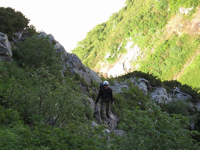 4:27源次郎尾根にトライ開始です。大ちゃんに取りつき地点はお任せでしたが、正しい場所が見当たらず、一度戻って先発した組が入った場所から取りつくことにします。