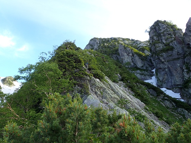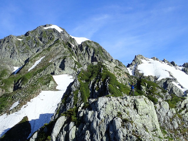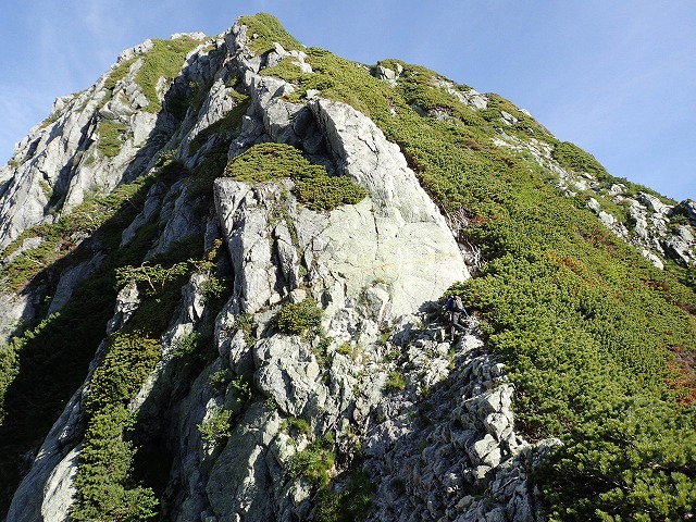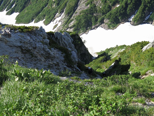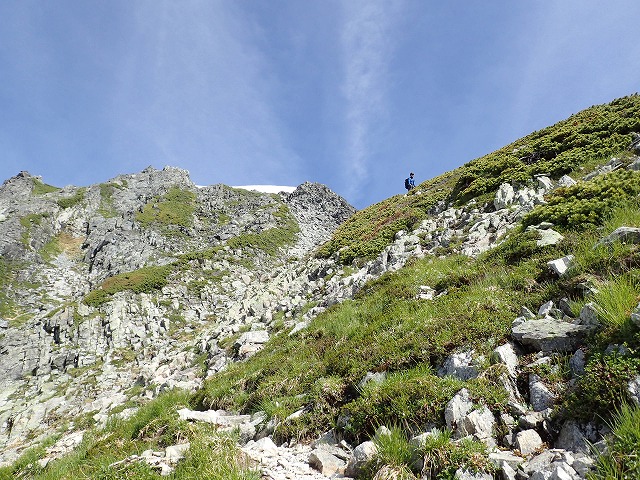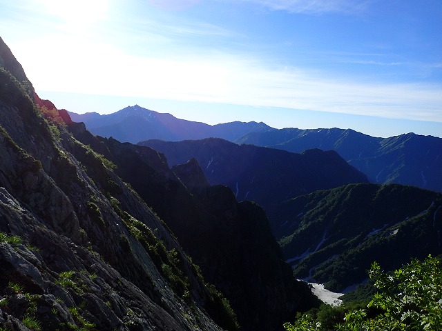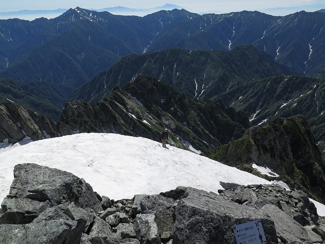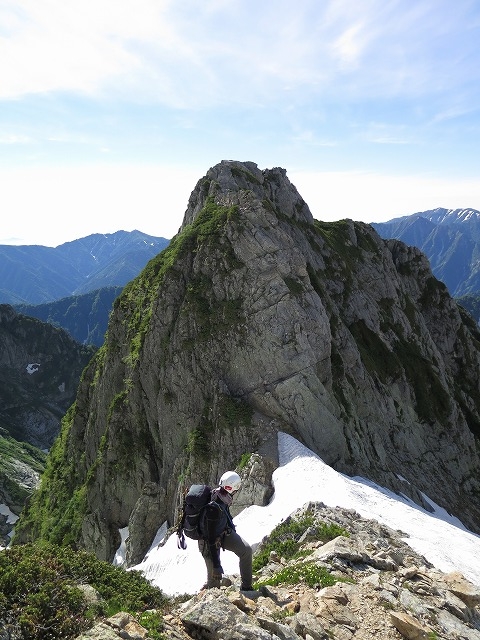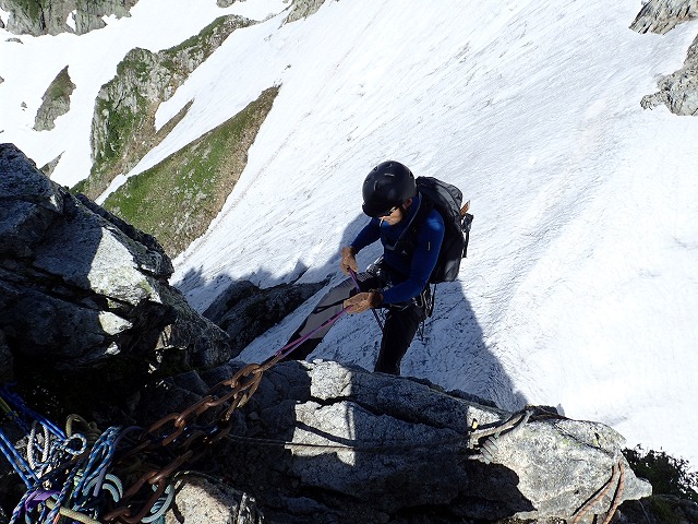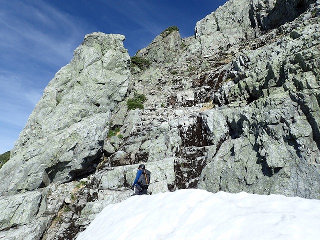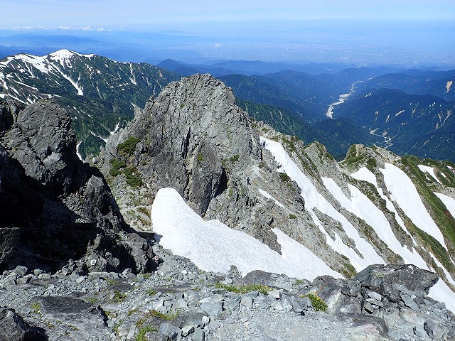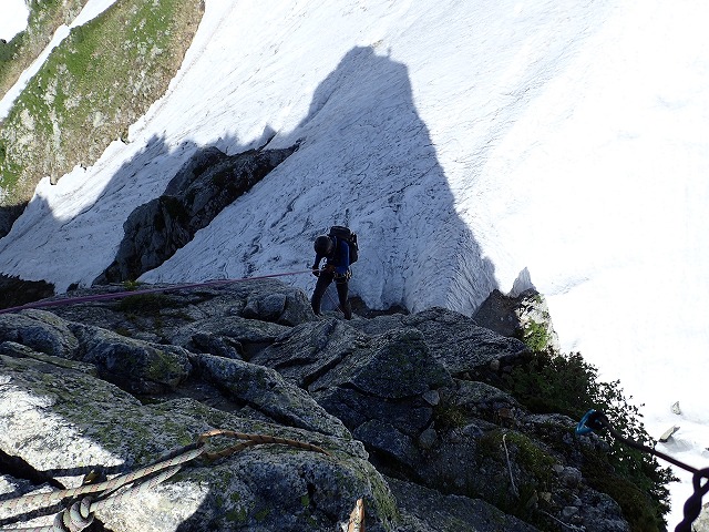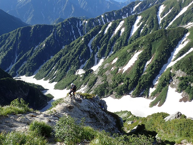 せっかく上がったのにまた20mばかし下ることになります。ここまで来るともう空中散歩といった感じでしょうか。快晴で雲一つありません。右は長次郎雪渓越しに八ッ峰がくっきりと見え、左は、平蔵の谷越しに前剣からの稜線が見えます。
