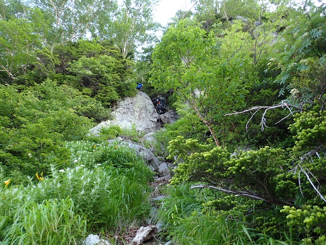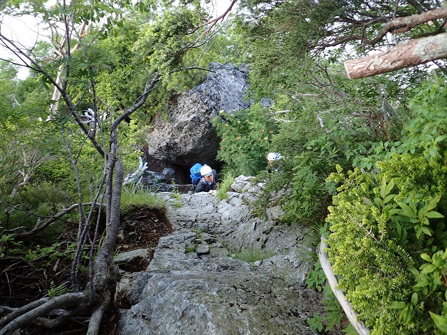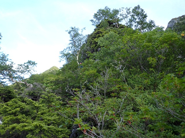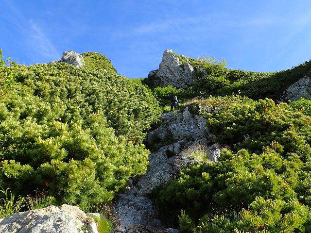 最初の出だしは、這松地帯を枝をかき分け急斜面を上がっていきます。