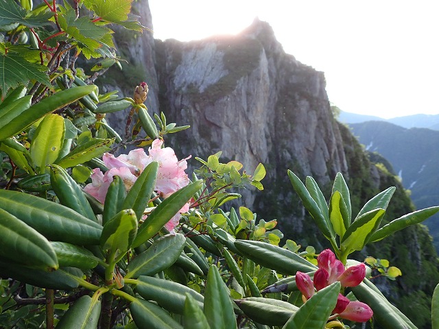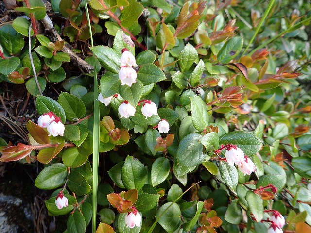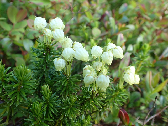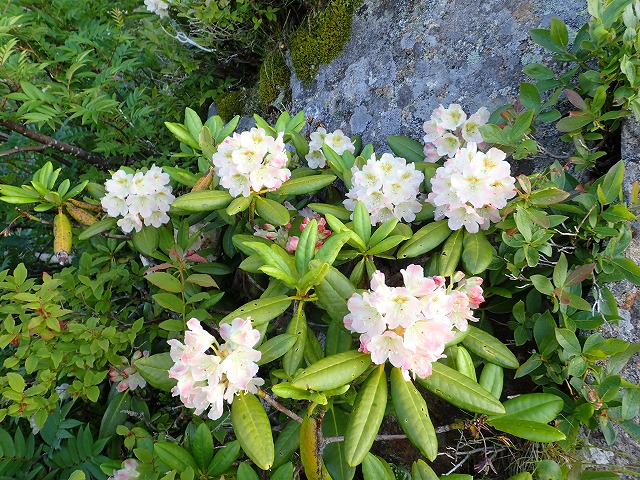 途中に高山植物も現れます。シャクナゲがきれいに咲いています。可愛い白い提灯のようなアカモノ・アオノツガザクラなどが目につき始めます。