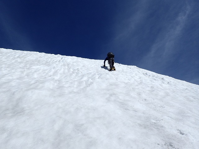 ただここから山頂までは、なんとなく登山道が出来上がっているようです。踏み跡をたどりながら登っていき、目の前に雪渓がでてきました。