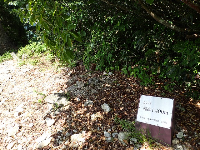 13:15標高1400mの看板前を通過。徐々に膝に力が入らなくなってきます。
