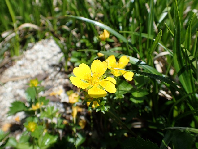 10:34 山頂を出発します。帰りは花の写真を撮っていくことに。山頂近くには、チングルマ・ミヤマリンドウ・キジムシロ。