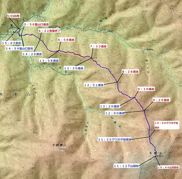往路:5時間01分 山頂滞在:28分 復路:3時間53分 計:9時間22分
