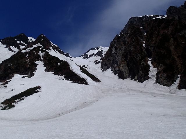 小窓に着いたところで、小窓雪渓を降り、鉱山道を探したのですが、その入口が分かりません。