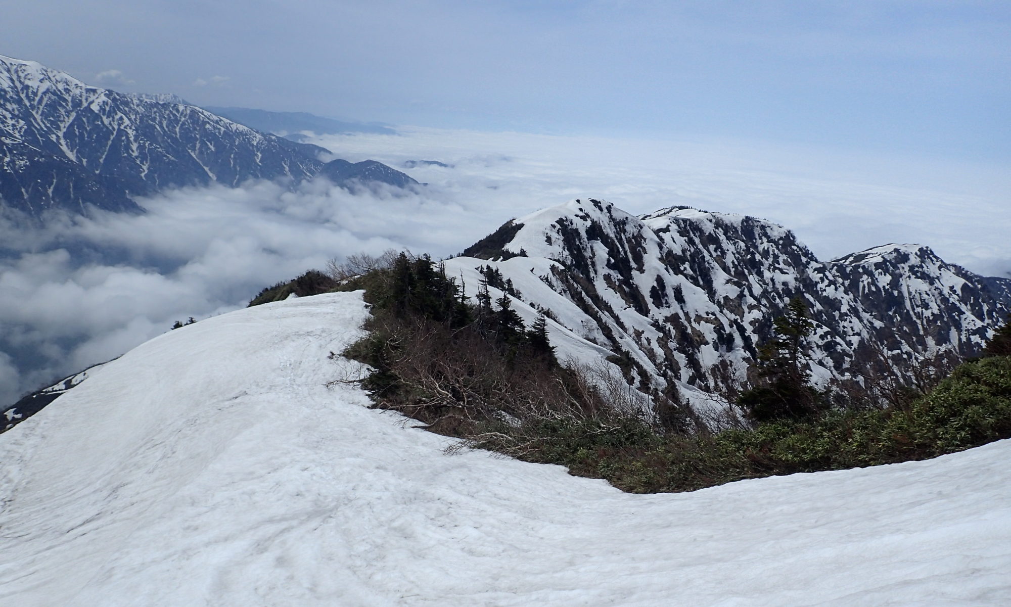 混雑が予想される立山を避けて、コット谷から大日岳へ。今年は雪が多かったにもかかわらず、最終堰堤までの雪がなくなっている。水量もあって左岸に渡れない状態。右岸側には、高巻きしなければクリアーできない箇所があり、行きから藪こぎでアドベンチャー。それでも最終堰堤からはサクサクとハイク。大日岳からのロング・シャウダー滑降も十分に楽しむことができた。