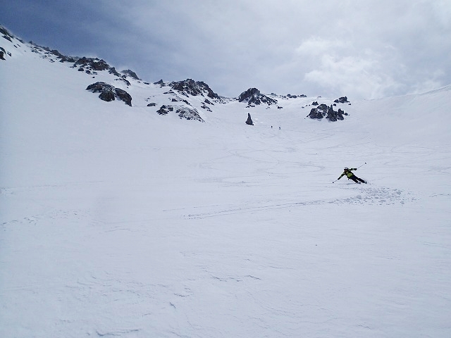 13日(土)の振休となった今日は、平日で混雑がないことを予想し、室堂から雄山へ。どの斜面を滑ろうか迷うぐらいにいい斜面が至る所に。迷ったあげく届け出通り「雄山社務所裏から先ずは南西ルンゼ」を一気に滑降。その後、山崎カールに移動し、登り上げてガスが出て来た「山崎カール」を慌てて滑降。ダブルで楽しむことができました。